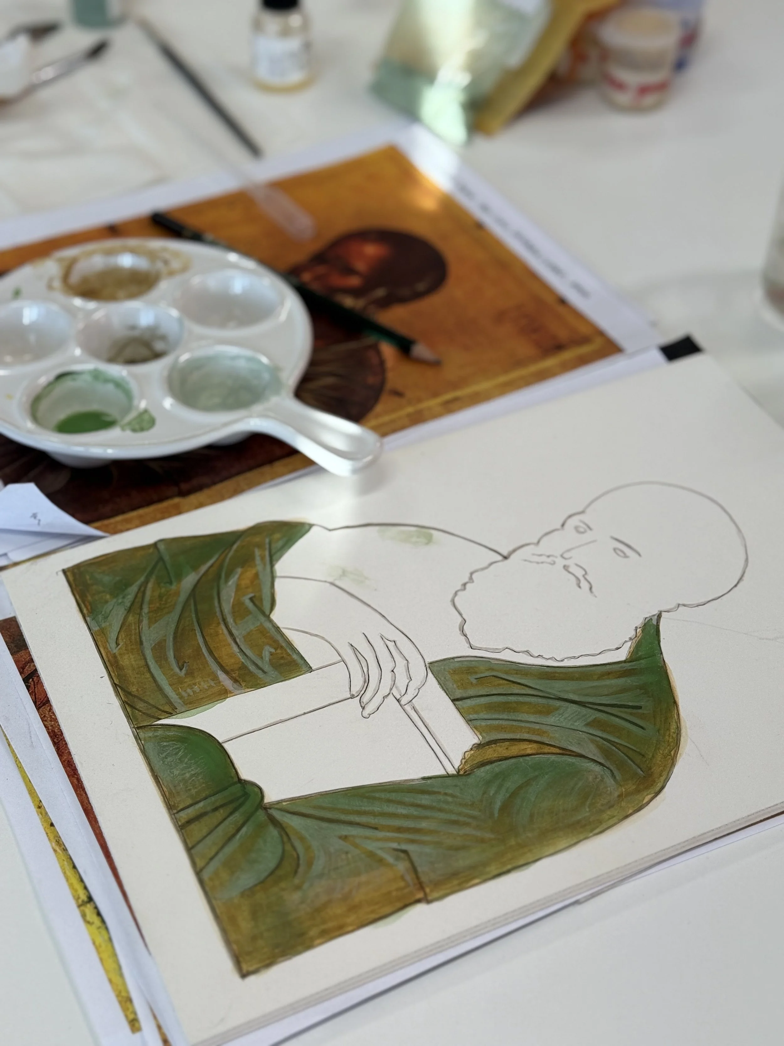 Tämä kurssi on suunnattu ikonimaalauksen perusteet jo hallitseville. Yhteistä aihetta ei ole, vaan tarkoituksena on maalata keskeneräistä ikonia. Voit myös aloittaa seuraavaa työtä.